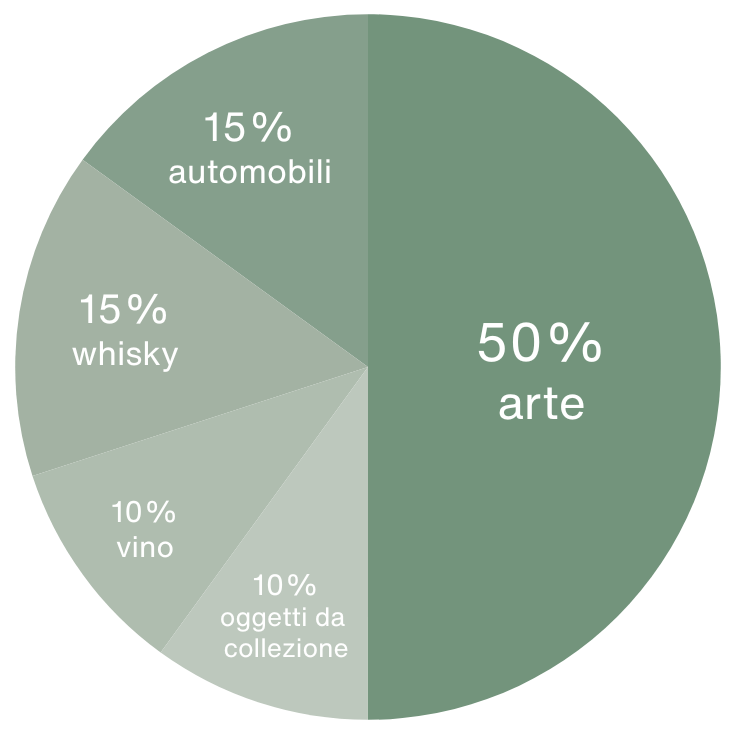 Ci concentriamo su investimenti con comprovata rarità e importanza culturale a lungo termine. Il portafoglio è diversificato tra arte, automobili, whisky, vino e oggetti da collezione, al fine di conciliare crescita e stabilità.